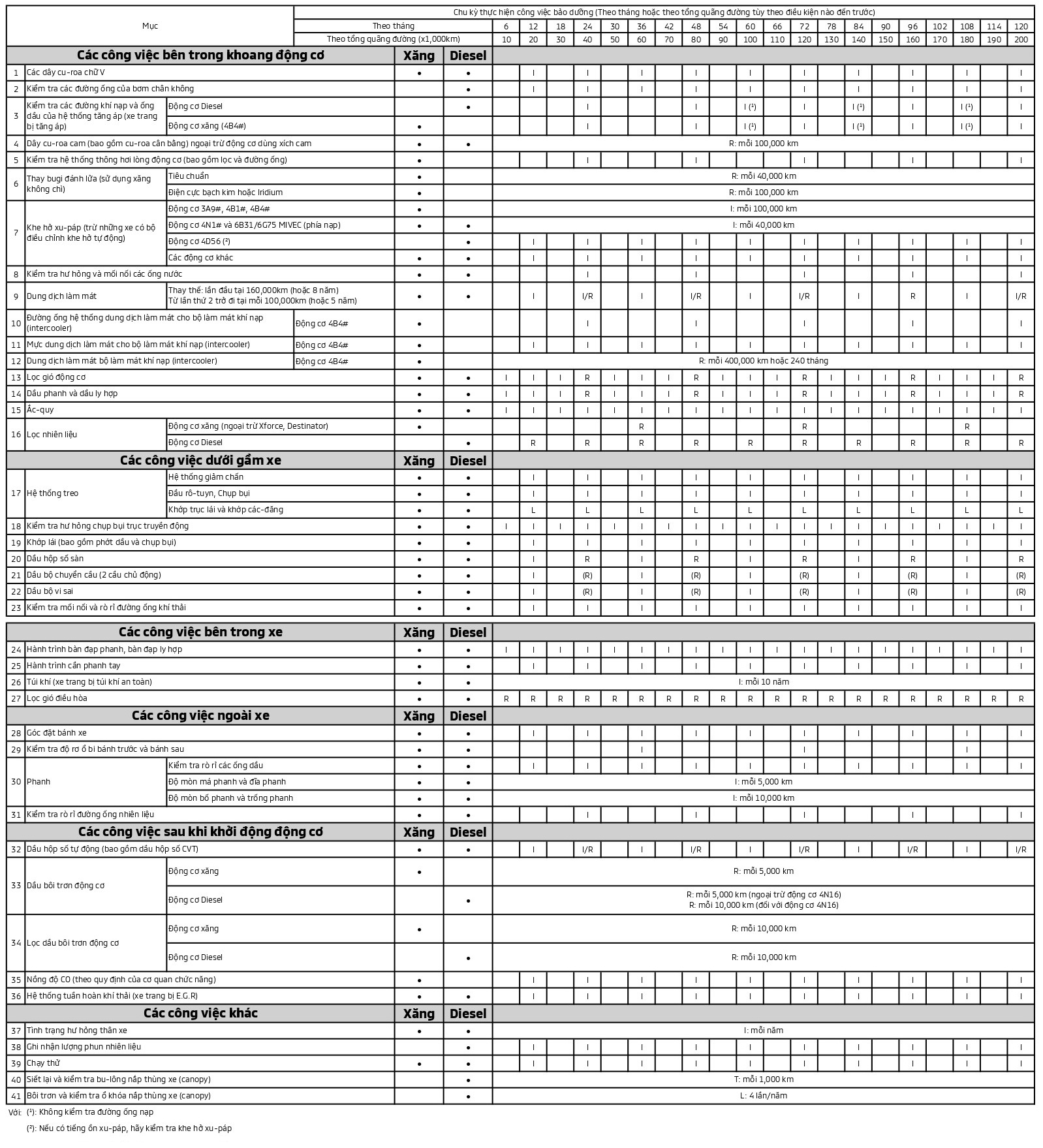 Để giữ cho xe luôn trong điều kiện hoạt động tốt nhất, Mitsubishi Motors Việt Nam khuyến nghị nên bảo dưỡng xe định kỳ mỗi 5.000km hoặc 3 tháng sử dụng (riêng All New Triton với động cơ 4N16 là mỗi 10,000km hoặc 6 tháng sử dụng) tùy theo điều kiện nào đến trước đến trước.